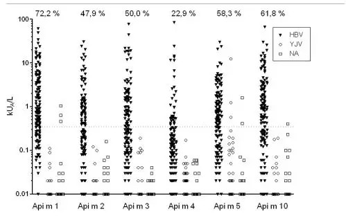 ①重組膜翅目毒液過(guò)敏原的IgE檢測(cè)被認(rèn)為可以提高膜翅目毒液過(guò)敏的診斷正確性。然而,對(duì)蜜蜂毒液過(guò)敏患者唯一可用的重組蜂毒(HBV)過(guò)敏原rApi m1的致敏頻率是有限的,這表明可能存在另外的蜜蜂毒液過(guò)敏原。②我們對(duì)蜜蜂毒液過(guò)敏病人進(jìn)行一系列蜜蜂毒液過(guò)敏原(組份)的敏感性分析。蜜蜂毒液過(guò)敏(HBV)的診斷(n = 144)是基于病史、皮膚試驗(yàn)結(jié)果和對(duì)HBV的過(guò)敏原特異性IgE水平。采用ImmunoCAP分析IgE對(duì)6種無(wú)交叉反應(yīng)碳水化合物(CCD)的HBV過(guò)敏原的反應(yīng)性。