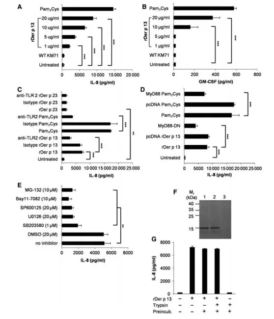 ① 屋塵螨(HDM)變應(yīng)原Der p 13可能是一種脂結(jié)合蛋白,能夠激活啟動(dòng)變應(yīng)反應(yīng)的關(guān)鍵先天信號(hào)通路;② 純化的rDer p 13通過(guò)質(zhì)譜、圓二色性、基于熒光的脂質(zhì)結(jié)合分析和硅結(jié)構(gòu)預(yù)測(cè)等方法來(lái)進(jìn)行表征分析;③ 采用ELISA、嗜堿性粒細(xì)胞脫顆粒試驗(yàn)和體外氣道上皮細(xì)胞活化試驗(yàn)檢測(cè)Der p 13的IgE結(jié)合活性和致敏活性;④ 熒光脂質(zhì)結(jié)合試驗(yàn)證實(shí),該蛋白質(zhì)對(duì)配體具有高度選擇性,并且它與脂肪酸結(jié)合具有典型的脂質(zhì)轉(zhuǎn)運(yùn)蛋白解離常數(shù);⑤ Der p 13 通過(guò)其脂質(zhì)結(jié)合能力,并由TLR2激活,然后在HDM過(guò)敏反應(yīng)中起作用。
