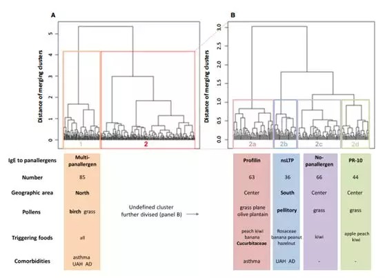 ① 花粉-食物綜合征(PFS)在觸發(fā)、嚴(yán)重程度、自然病史、并發(fā)癥和對(duì)治療的反應(yīng)方面具有異質(zhì)性;② 納入1271名意大利兒童,使用ImmunoCAP FEIA測(cè)定泛過(guò)敏源Phl p 12 (profilin), Bet v 1 (PR-10), 和Pru p 3 (nsLTP)的IgE;④ 在一個(gè)以多次接觸花粉為特征的地中海國(guó)家,PFS是兒童SAR復(fù)雜而頻繁的并發(fā)癥,具有五種不同的內(nèi)型,以特異性IgE對(duì)泛變應(yīng)原的敏感性為特征。