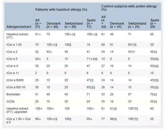 ①對(duì)榛子的食物過(guò)敏同時(shí)伴或不伴花粉過(guò)敏。②我們?cè)噲D在西班牙、瑞士和丹麥三個(gè)國(guó)家中評(píng)估一組榛子過(guò)敏原,用于榛子過(guò)敏的診斷。③52例對(duì)榛子雙盲、安慰劑對(duì)照食物挑戰(zhàn)試驗(yàn)結(jié)果呈陽(yáng)性的患者;5例有過(guò)敏反應(yīng)史;花粉過(guò)敏但榛子耐受62例;63例非特應(yīng)性受試者作為對(duì)照。采用ImmunoCAP法對(duì)榛子提取物、重組榛子過(guò)敏原(rCor a 1.04、rCor a 2、rCor a 8、rCor a 11)、天然過(guò)敏原(nCor a 9、nCor a Bd8K、nCor a Bd11K)的血清特異性IgE水平進(jìn)行分析。