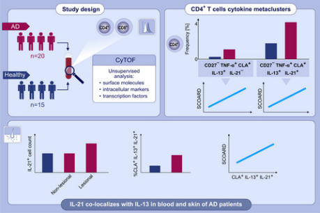 Background: Flow cytometry is a well-accepted approach for immune profiling; however, its value is restricted by the limited number of markers that can be analyzed simultaneously. Mass cytometry/CyTOF offers broad-scale immune characterization integrating large number of parameters. While partial blood phenotyping was reported in atopic dermatitis (AD), patients’ comprehensive profiling, critical for leveraging new targeted treatments, is not available. IL-21 may be involved in inflammatory skin diseases but its role in AD is not well established.