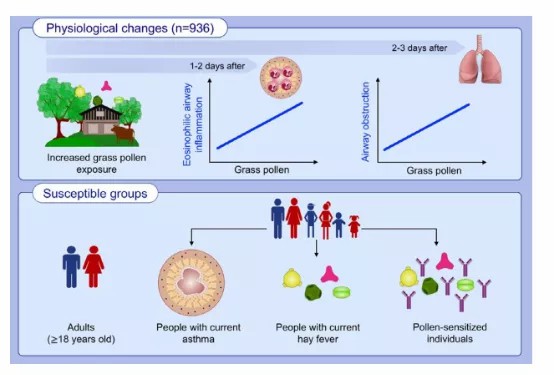 Conclusion: Grass pollen exposure was associated with eosinophilic airway inflammation 1-2 days after exposure and airway obstruction 2-3 days after exposure. Adults and individuals with asthma, hay fever, and pollen sensitization may be at higher risk.