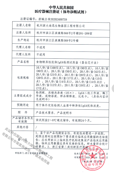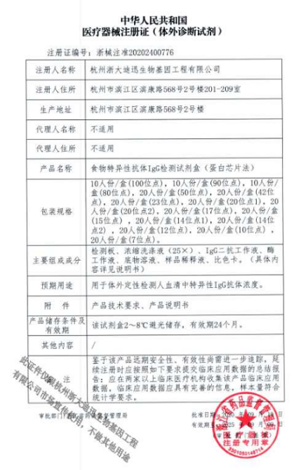 2020年9月浙大迪迅自主研發(fā)的兩個新產品100項食物特異性抗體IgG檢測試劑盒(蛋白芯片法)、食物特異性抗體IgG4檢測試劑盒(蛋白芯片法)正式取得浙江省藥品監(jiān)督管理局頒發(fā)的二類醫(yī)療器械注冊證,其中100項食物特異性抗體IgG4檢測試劑盒(蛋白芯片法),是國內首家獲得醫(yī)療器械注冊證的產品,填補國內空白,同時榮獲浙江省創(chuàng)新醫(yī)療器械。